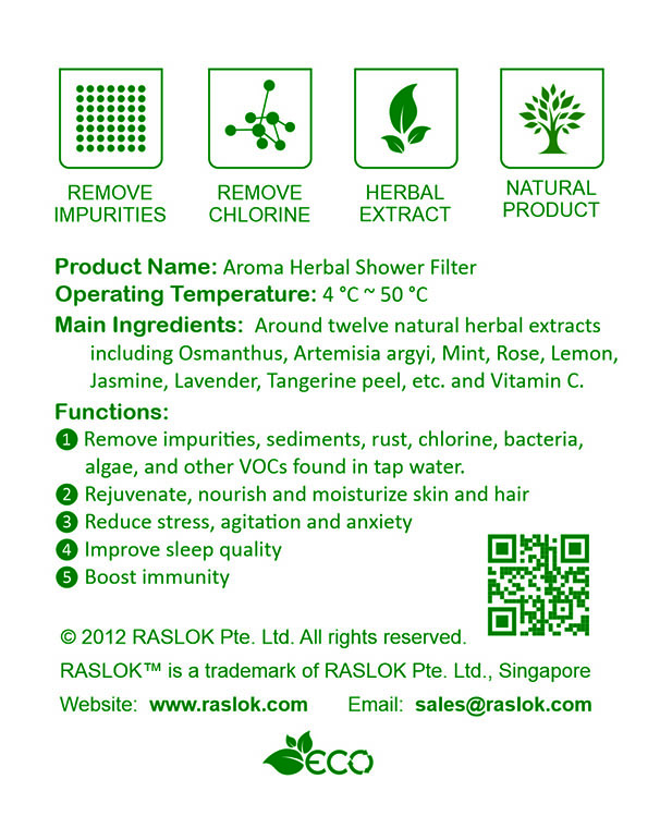 RASLOK Aroma Herbal Shower Filter is a natural herbal product that removes rust, sediment, and chlorine etc., infusing your shower with aromatic fragrances, turning it into a luxurious experience.